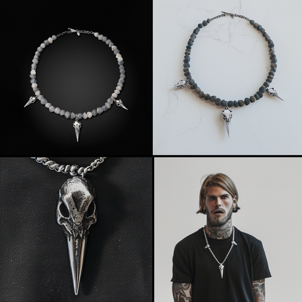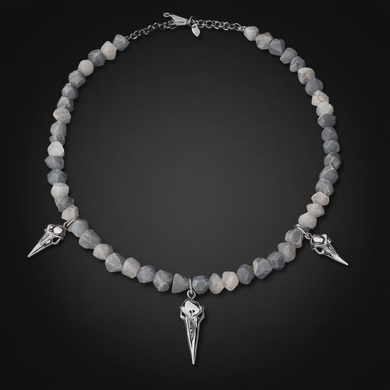 The Raven Relic necklace channels the quiet power of carrion birds-symbols of wisdom, transformation, and watchfulness. Three sculpted raven-skull charms anchor a strand of raw-textured grey stones, echoing storm clouds and slate. Polished highlights on the silver bring a sharp glint against the matte beads, creating a piece that feels both ancient and modern-made to stand alone or layer with chains.