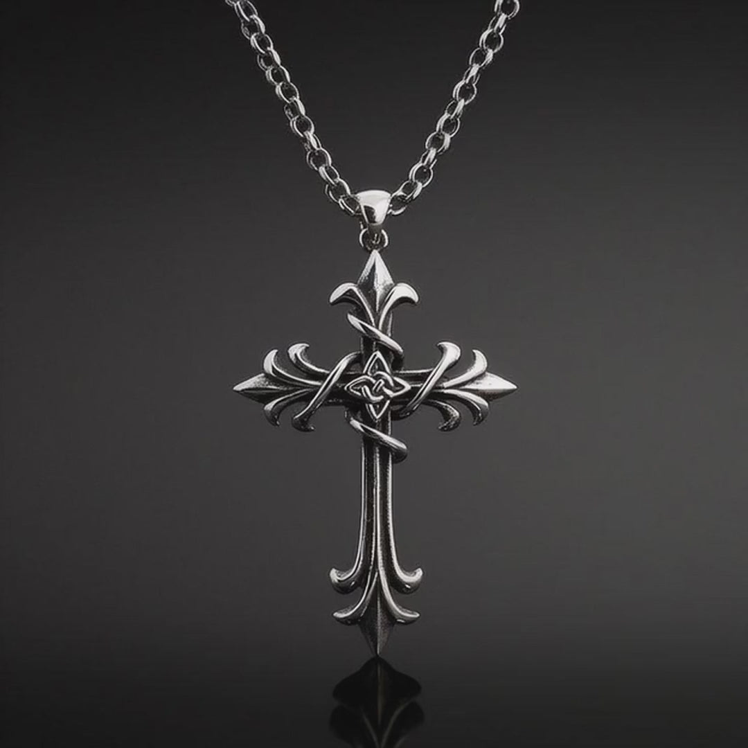Drawn from cathedral stonework and forged wire talismans, the Barbed Fleur Cross is built around a knot at the heart-an emblem of resolve and protection. The sculpted arms carry fleur-de-lis terminals that flare like wings, while a wrapped “barb” traces the center line. Oxidized valleys create shadow so the bright edges flash as you move, making the cross legible from across a room yet quiet enough for everyday wear.